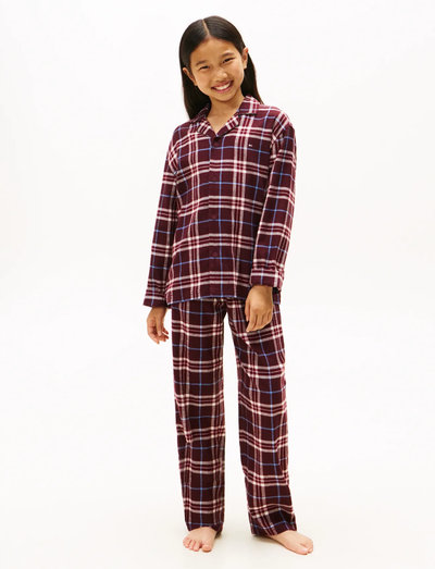 Detta tvådelade pyjamasset är perfekt för sängdags och har en klassisk skjorta med knäppning och matchande underdelar. Det genomgående rutmönstret ger en tidlös känsla. Ett bekvämt val för en god natts sömn.