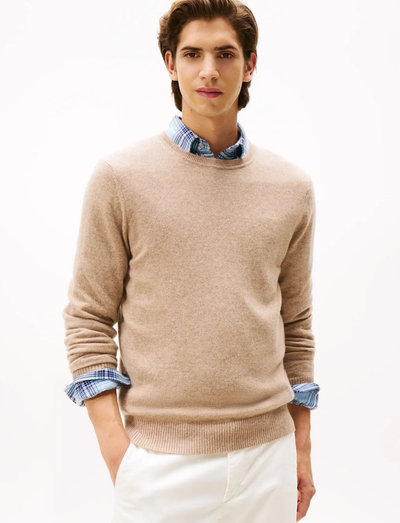Denna stickade tröja med rund hals är tillverkad av ren kashmir och ger enastående mjukhet och värme. Den fina stickningen ger en slät textur, medan de ribbade kanterna säkerställer en åtsittande och bekväm passform. En diskret flaggdetalj på manschetten ger en signaturtouch.