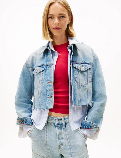 Denna denimjacka har en croppad silhuett och ger en modern twist till en klassisk stil. Den har knäppning fram och bröstfickor, vilket kombinerar funktionalitet med en fashionabel känsla.