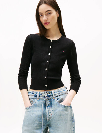 Delikata pointelle-detaljer lyfter denna klassiska kofta. Designen med rund hals och knäppning framtill erbjuder mångsidiga stylingalternativ, medan den subtila märkningen tillför en touch av diskret elegans.