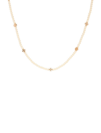 Delikata imitationspärlor utgör detta raffinerade halsband. Accenter med signaturlogotyper, den fästs med ett karbinhakelås.