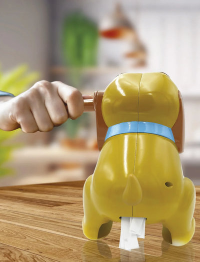 A fun family game night is guaranteed when the dog eats the homework! Feed the homework to the dog, krank its ear, piece together the shredded paper and guess the picture in 30 seconds! The player with the most treats wins! For 2–4 players. 5+