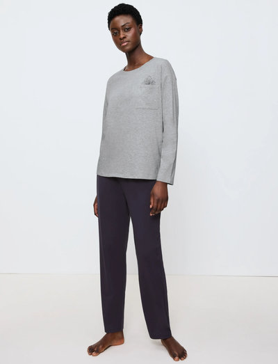 Njut av en vilsam natts sömn i detta bekväma tvådelade set. Den långärmade överdelen har en bröstficka, medan de matchande underdelarna ger en avslappnad passform.