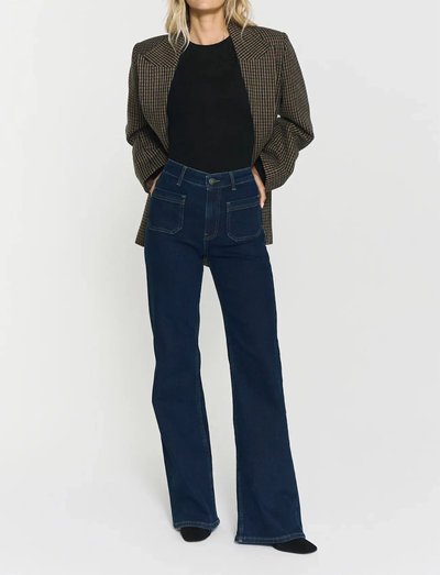 Dessa jeans är designade med en smickrande hög midja och utsvängda ben, vilket ger en vintage-inspirerad silhuett. Det stretchiga tyget säkerställer en bekväm passform, medan designen med fyra fickor, gylf med dragkedja och bälteshällor ger praktisk användning. Dessa jeans är tillverkade med ISKO Recall™ shape memory-tyg och behåller sin smickrande passform och kräver mindre frekvent tvätt.