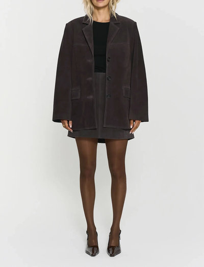 The Vaiana Suede Blazer features an oversized fit with shoulder pads. It's fully lined and comes with welt pockets with flaps and a three-button closure.