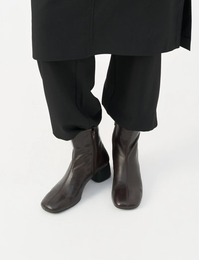 Denna ankelstövel är tillverkad i slätt läder och har en mjukt rundad tåform och en praktisk dragkedja på sidan. Den låga klacken ger en subtil höjd, medan den kromfria läderinnersulan ger komfort.
