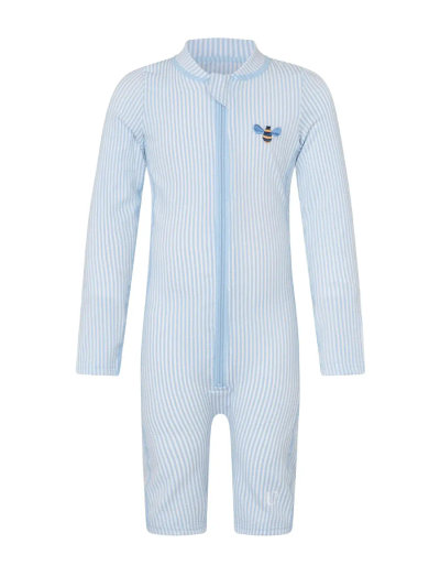 Denna långärmade baddräkt är designad för komfort och skydd och är idealisk för aktiva barn. Det ventilerande, snabbtorkande tyget ger utmärkt stretch och UV-skydd på täckta områden. Funktionerna inkluderar flatlocksömmar, en dragkedja fram med hudskydd och en lekfull design.
