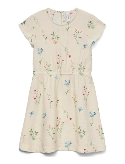 Denna kortärmade klänning med ett blommigt tryck över hela plagget är ett charmigt tillskott till varje garderob. Den har en bekväm, normal passform, en rund halsringning och en skärning i midjan för extra definition. Knäppningen med knapp och ögla baktill gör den enkel att ta på.