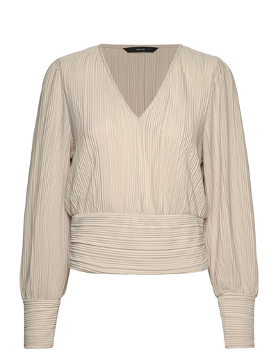 Denna topp har en smickrande V-ringning och långa ärmar, vilket ger en sofistikerad silhuett. De subtila plisseringarna tillför textur och visuellt intresse, vilket gör den till ett mångsidigt plagg för både vardagliga och mer uppklädda tillfällen.