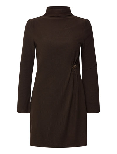 Denna korta klänning är ett enkelt val för en avslappnad stil och har långa trumpetärmar och en smickrande båtringning. Knappdetaljerna ger en touch av sofistikering, vilket gör den lätt att klä upp eller ner för alla tillfällen.