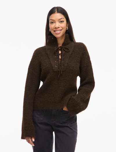 Denna stickade topp med långa ärmar är perfekt för kyligare dagar, och har en hög hals och snörning. Det luftiga stickade tyget är dessutom skrynkelfritt, vilket gör den idealisk för vardagsbruk. Designad med en normal passform.