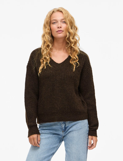 Denna stickade tröja har en V-ringning och nedhasade axlar som ger en avslappnad och bekväm känsla. De långa ärmarna har ribbade muddar för en åtsittande passform. Det luftiga stickade materialet är skrynkelfritt, vilket gör den perfekt för vardagsbruk.