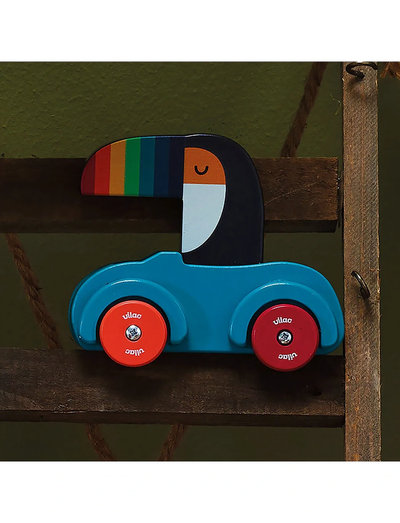 Blue wooden car with colured wheels and a funny toucan with a rainbow beak.Push the toucan to hear the car honk.The car is designed for children from 18 months and illustrated by Andy Westface. This educational toy will help the child develop imagination and fine motor skills. At the wheel of this racing car, a cute Tukan. When the child presses the tukan's head, it makes a fun sound. This sound detail stimulates the interest of toddlers, while offering them direct interaction with the toy. The car is perfectly adapted to their small hands, promoting easy handling.Development of fine motor skills and coordinationBy handling this car and pressing the tukan's head, the child works on fine motor skills. These simple gestures contribute to the development of hand muscles and hand-eye coordination. Pushing the car, rolling it, and pressing the tukan's head to hear the sound strengthens the child's ability to interact with their environment. This type of activity helps develop essential skills for future learning, such as writing. Wooden toy, durable Development of fine motor skills Discovery, observation, reflection Vocabulary enrichment Montessori educational toy First essential educational toy Colorful universe Stimulation of the imagination Sound surprise by pressing the tukan's headContent 1 wooden car with built-in horn