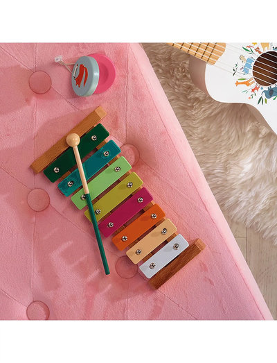 Wooden music set, including 5 instruments: tambourine, metallophone, egg maracas, double mascaras and castanets, all gently illustrated by Sarah Betz-Cubeely.Introduce kids to music from an early age and let them explore different sounds, rhythms and tones. When the childs is playing with these instruments, he will develop his musical ear, his sense of rhythm, and his listening skills. The wooden musical set is an excellent tool to strengthen the child's fine motor skills and coordination. By handling the maracas, hitting the tambourine, playing the metallophone or using the castanet, the child works on hand-eye coordination and the precision of movements. Each instrument offers a different playing experience, allowing him to refine gestures and gain dexterity. This activity also prepares the child for future learning, such as writing, by strengthening the muscles of his little hands. Wooden toy instruments Toys for introducing sounds and rhythms Development of rhythm Stimulation of creativity Development of fine motor skills Promotes active listening Multisensory activity: touch, hearing and sight Non-electronic instruments.