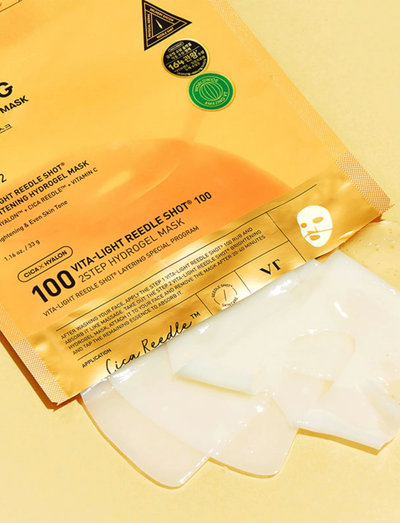 Vita-Light Reedle Shot 100 2-Steps Hydrogel Mask är en tvåstegsmaske som är utformad för att ljusa upp och återuppliva matt och ojämn hudton. Första steget, Vita-Light Reedle Shot 100, använder avancerad CICA REEDLE™-teknologi för att förbättra absorptionen och leverera en kraftfull blandning av ljusnande ingredienser djupt in i huden. Andra steget, Vita-Light Brightening Hydrogel Mask, fäster perfekt på huden och frigör en koncentrerad ampull som fortsätter att motverka missfärgning och främja en strålande hy.