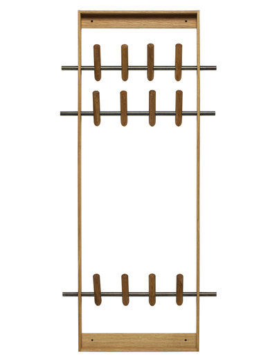 Tre justerbara klädhängare, monterade i en ram av bambu.