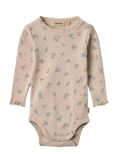 Long-sleeved printed rib body in a soft organic cotton blend for your baby.- Regular fit- Cotton picoting/lace details at the neckline- Frill edges at the cuffs- Press buttons at the shoulder and crotch- Gatherings at back of leghem for a better fit- Rib structure- Pointelle pattern- Wheat signature printWheat's body is unisex and a true essential in your babys wardrobe, as it can be worn on its own or as an extra layer underneath everyday clothing. The bodies either have press buttons at the shoulder or buttons at the neck for better comfort, when you are dressing your baby. The body also has press buttons at the bottom, which makes it easier for you to access your babys diaper.---- Standard 100 by OEKO-TEX®- 100% Organic cotton- The product is GOTS certified