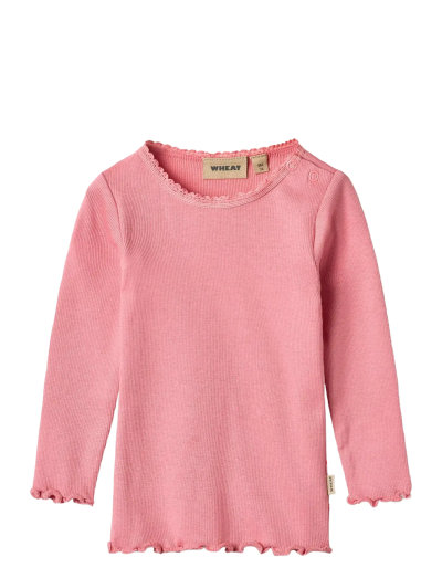 Rib t-shirt with long sleeves in a soft cotton blend for your child.- Rib construction- Ring press-button at the left shoulder opening- Babylock finish on sleeve cuffs and bottom hems- Lace details at necklineThis rib t-shirt is crafted from a blend of modal and organic cotton, offering a soft and comfortable feel against the skin. The long sleeves make it suitable for layering during cooler weather or wearing on its own during milder days.The t-shirt features a practical ring press-button at the left shoulder opening, making it easier to dress your little one. The simple design pairs well with our Rib Leggings Maddy for a comfortable everyday outfit.---Jersey Solid rib: 48% modal, 48% organic cotton, 4% elastaneOEKO-TEX® Standard 100 certified Certificate No. 1876-283