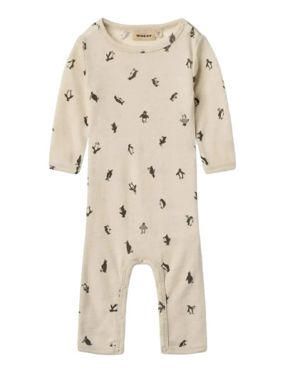 Wheat Long-sleeved jumpsuit in soft merino wool jersey for your baby. - Regular fit- Press buttons at the shoulder and inseam- PrintedWheat’s wool wear is specially designed to keep your child warm in the cold weather, while still keeping them from overheating, as wool has the unique quality that it helps regulate body temperature. The wool styles are great for layering and soft on bare skin.Wheat’s jumpsuit for babies is both cute and comfortable. The jumpsuit has press buttons at the shoulder and along the inseam of the legs, which makes it easier for you to dress your baby. The jumpsuit can be worn on its own or as an extra layer underneath everyday clothing. It is available in beautiful colours and hand drawn prints, which are made by Wheat’s in-house design team. Composition- Standard 100 by OEKO-TEX®- 100% Merino wool