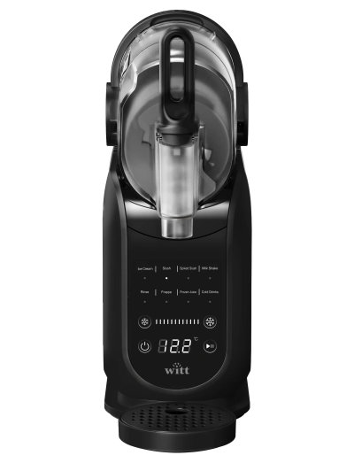 Witt Premium Element - Black is a versatile frozen drink maker with 1.8 L capacity, matte black finish, and an intuitive display. It features temperature control and automatic cleaning for easy maintenance. Create slush ice, soft ice, spiked slush (alcoholic), milkshakes, frappes, frozen juice, and cold drinks at home. The machine’s dedicated programs ensure perfect texture for every beverage, from cocktails to kid-friendly treats.