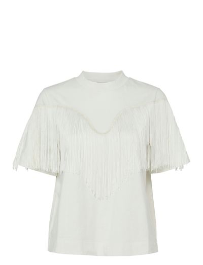 Den här YAS-t-shirten har en klassisk rund hals och korta ärmar. Den har en unik design med fransar på framsidan och ärmarna, vilket ger en touch av stil och struktur. T-shirten är gjord av ett bekvämt och andningsbart tyg, vilket gör den perfekt för vardagsbruk.
