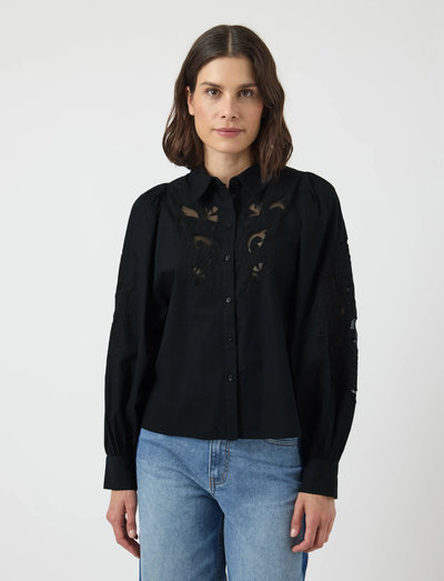 Denna långärmade skjorta är tillverkad av krispig bomullspoplin och har fina spetsdetaljer. Puffärmarna och manschetterna med knappar ger en elegant touch, medan knäppningen säkerställer en bra passform. Designad i en standard passform som ger både komfort och stil.